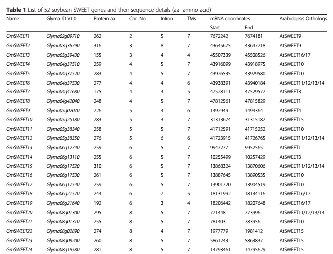 Patil G. ?et al. Soybean (Glycine max) SWEET gene family: insights through comparative genomics, transcriptome profiling and whole genome re-sequence analysis. BMC Genomics. 2015