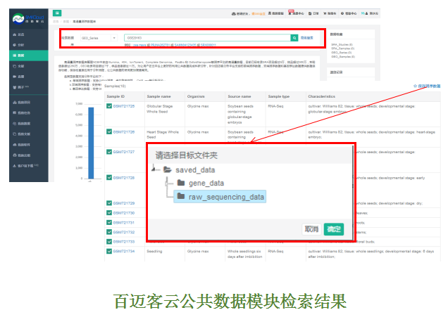 1)下載大豆RNA-seq公共數(shù)據(jù)集: 數(shù)據(jù)集1 SRA數(shù)據(jù)庫編號:PRJNA140081. 包含14個樣本,其中11個樣本為生殖組織來 源(花、豆莢、種子),3個為營養(yǎng)組織來源(葉、根、根瘤) 數(shù)據(jù)集2 GEO數(shù)據(jù)庫編號: GSE29163. 包含10個樣本,其中6個樣本為生殖組織來源(花、花芽、種子),4個樣本為營養(yǎng)組織來源(根、莖、葉、幼苗) 該步驟可進入BMKCloud_數(shù)據(jù)庫模塊按數(shù)據(jù)編號完成數(shù)據(jù)檢索及一鍵保存,保存后的數(shù)據(jù)可直接調用百邁云平臺的分析模塊BMKCloud_APP進行后續(xù)分析。