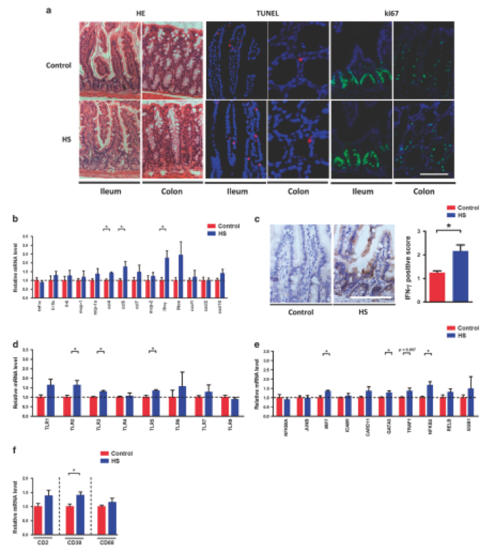 腸道生態(tài)失調(diào)通常與腸道病理生理學的改變有關(guān),研究人員檢查了慢性HS喂養(yǎng)對腸道變化的影響。在對照組和HS-喂養(yǎng)組小鼠的回腸和結(jié)腸上皮細胞形態(tài)沒有差異(圖3a)。此外,通過TUNEL和ki67染色鑒定的相似數(shù)量凋亡和增殖細胞表明,慢性HS喂養(yǎng)不影響腸道中的細胞死亡(圖3a)。然而,研究人員發(fā)現(xiàn)炎癥標志物表達被慢性HS攝入顯著改變。特別是,Ccl4,Ccl5和Ifn-γ在HS小鼠的回腸中表現(xiàn)出更高的mRNA水平(圖3b)。 IFN-γ免疫組織化學在回腸中的結(jié)果證實了基因表達數(shù)據(jù)(圖3c)。由于TLR家族蛋白和Nf-κB是參與病原體相關(guān)免疫應答的主要分子,進一步評估TLR家族和Nf-κB基因表達,發(fā)現(xiàn)TLR2,TLR3和TLR5mRNA水平在回腸中趨于更高(圖3d)。同時,HS處理后IRF7,GATA3和NFKB2的表達顯著上調(diào)(圖3e)。此外,HS喂養(yǎng)后白細胞中CD38的表達在回腸中升高(圖3f)。然后通過RNA測序進行轉(zhuǎn)錄組分析,并比較涉及“細胞因子 – 細胞因子受體相互作用”,“ NF-κB信號通路“和”Toll樣受體信號通路“。在回腸和結(jié)腸中,兩組之間許多基因的表達是不同的??偟膩碚f,這些數(shù)據(jù)表明慢性HS攝入導致腸炎癥反應中斷。
