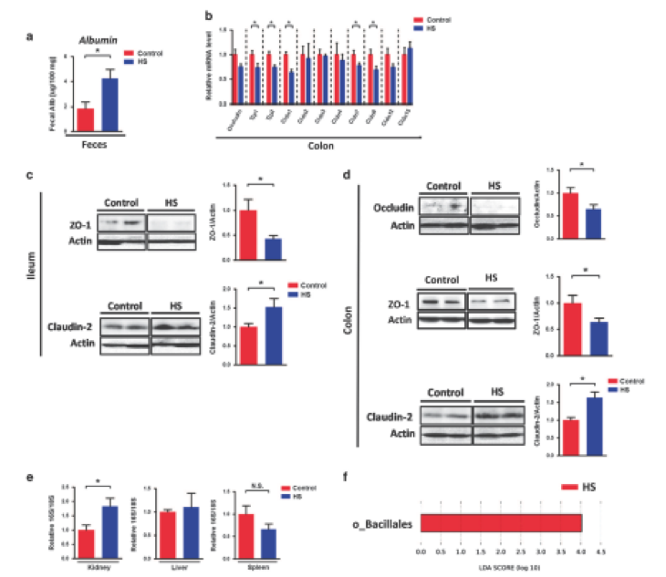 腸道免疫反應受損始終與腸道屏障功能障礙有關(guān),研究人員研究了HS的攝入如何影響腸道屏障功能。HS攝入顯著降低了tjp-1,tjp-2,claudin-1,claudin-7和claudin-8基因的表達(圖4a)。 此外,與對照小鼠相比,HS攝入后,回腸和結(jié)腸中屏障形成的緊密連接ZO-1蛋白水平和結(jié)腸中的Occludin蛋白水平顯示出較低的趨勢(圖4c和d)。 另一方面,在HS喂養(yǎng)回腸和結(jié)腸后,成孔緊密連接蛋白Claudin-2蛋白水平顯著較高(圖4c和d)。這些數(shù)據(jù)清楚地表明腸道腸道屏障被慢性HS攝入所破壞。
