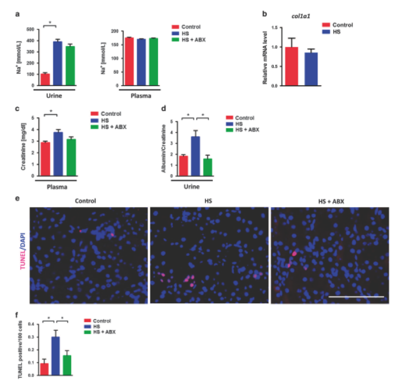 為了進一步闡明HS攝入后腸道生態(tài)失調(diào)和腎損傷之間的關(guān)系,給小鼠喂養(yǎng)多粘菌素B和新霉素。抗生素給藥確實恢復了HS飼喂誘導的回腸Ifn-γ過表達,通過糞便白蛋白和FD-4滲透監(jiān)測腸道泄漏,以及通過血漿內(nèi)毒素水平和腎臟16s / 18s比率監(jiān)測的細菌移位,通過尿和血漿Na +濃度測量,抗生素不改變鈉負荷(圖5a)。雖然8周HS喂養(yǎng)并未引起纖維化等進展性腎損傷,但由col1a1 mRNA水平監(jiān)測(圖5b),HS喂養(yǎng)增加了血漿肌酐水平。更重要的是,與對照組小鼠相比,HS-喂養(yǎng)小鼠腎功能障礙的主要標志物尿白蛋白/肌酐比率顯著增加,抗生素治療幾乎可以完全恢復腎功能(圖5d)。另外,TUNEL染色顯示抗生素施用可以降低HS誘導的凋亡細胞的升高(圖5e和f)。總之,該數(shù)據(jù)表明,抗生素治療能夠改善腸道滲漏和HS喂養(yǎng)引起的早期腎損傷。